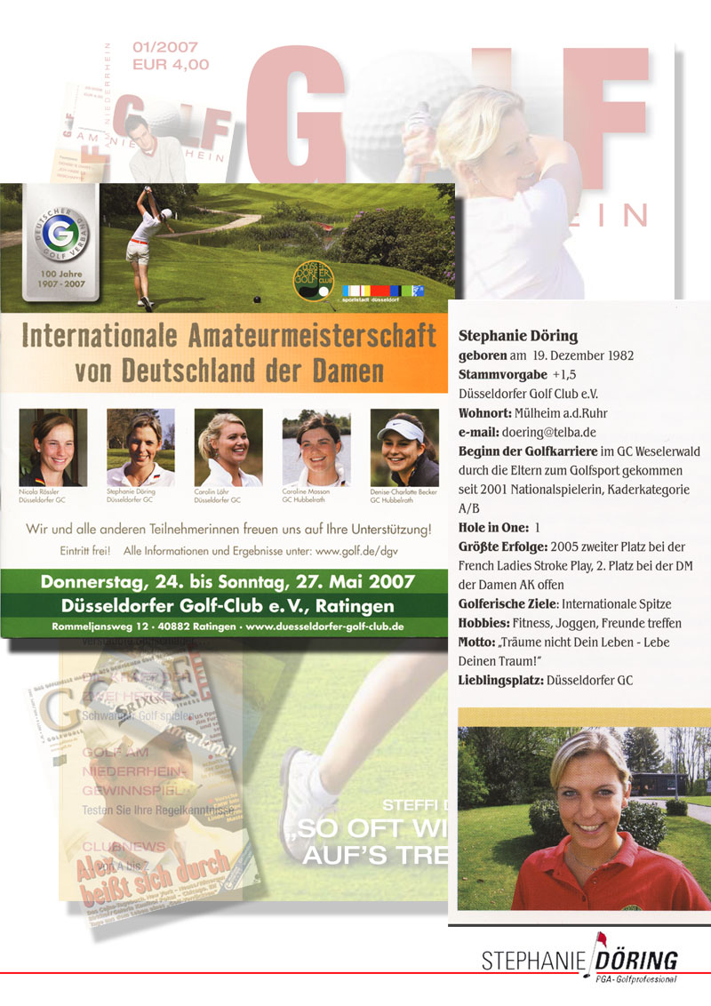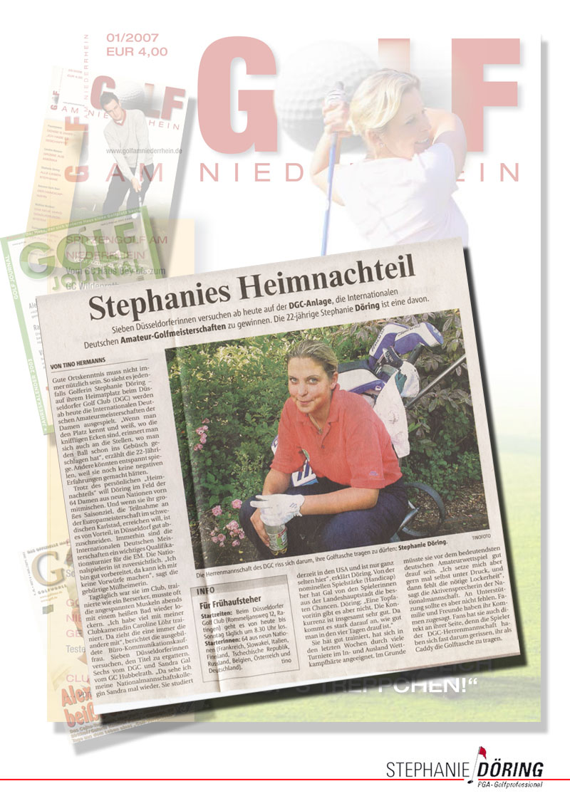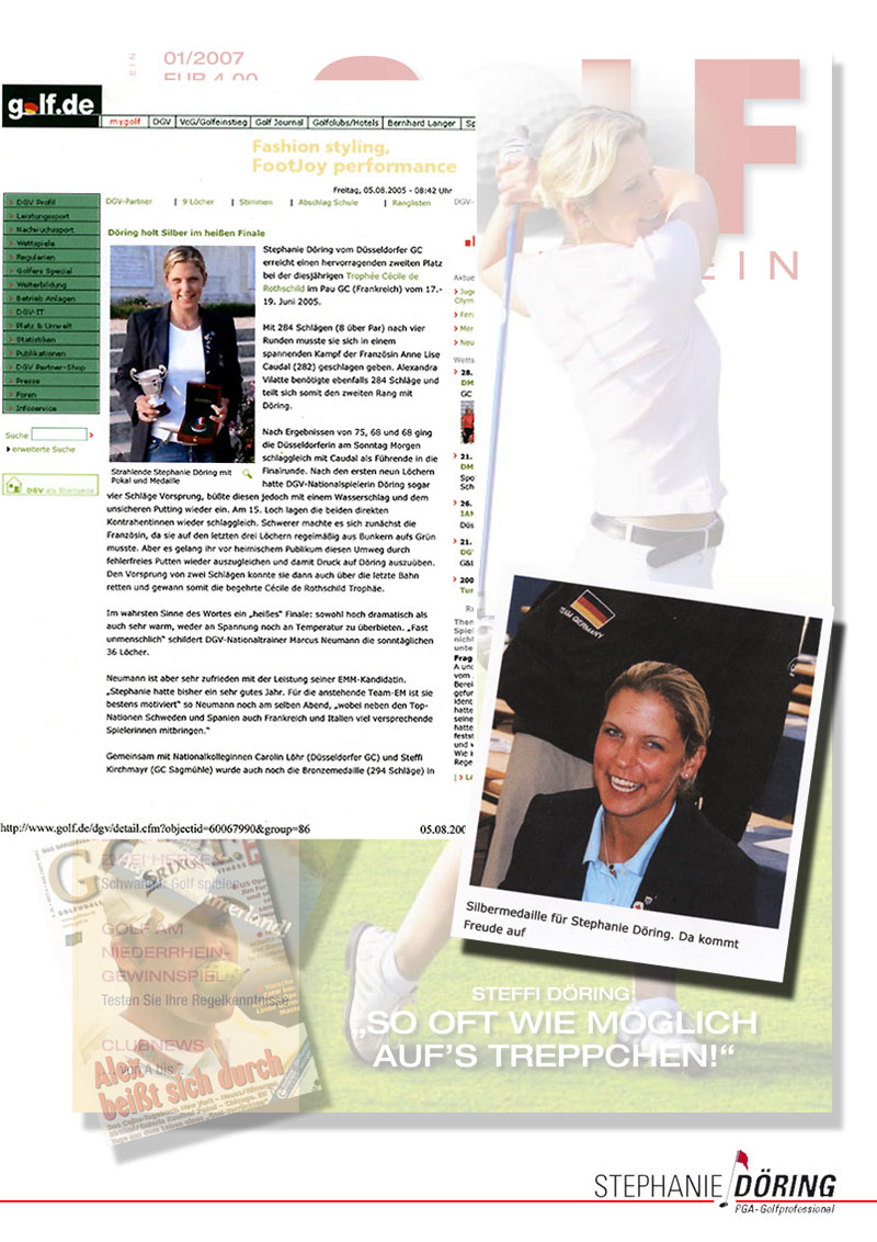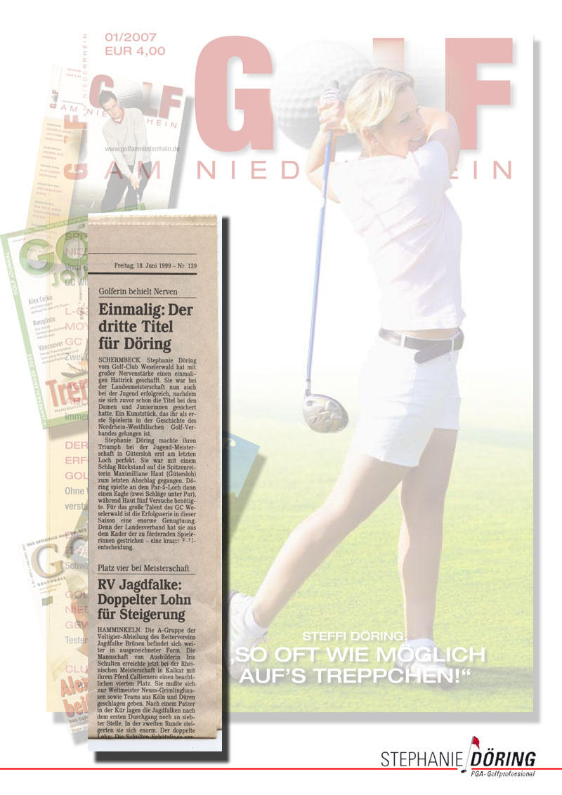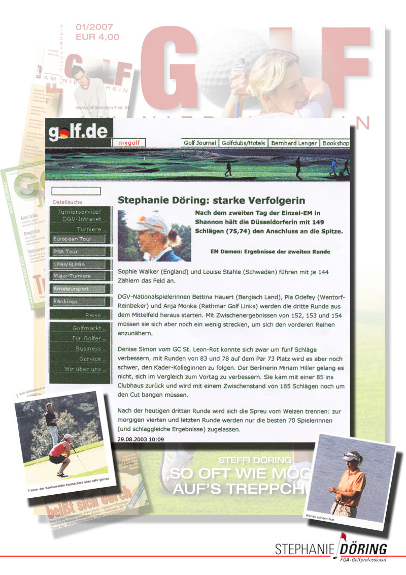 Hallo, mein Name ist Stephanie Döring. Ich spiele bereits seit 1994 Golf und es ist ein wesentlicher Bestandteil meines Lebens. Der Spaß an der Bewegung, die Konzentration und gleichzeitig die Kraft sowie die Faszination, die dieser Sport von Anfang an auf mich ausübte, veranlasst mich dazu, auch anderen diesen herrlichen Sport zwanglos, und mit Freude beibringen zu wollen.