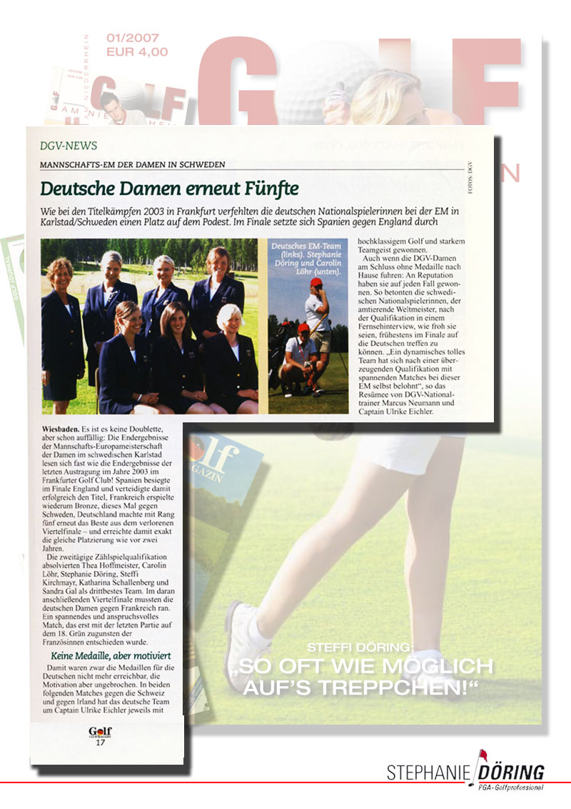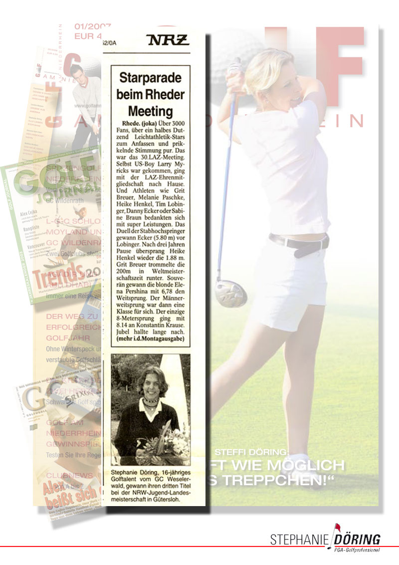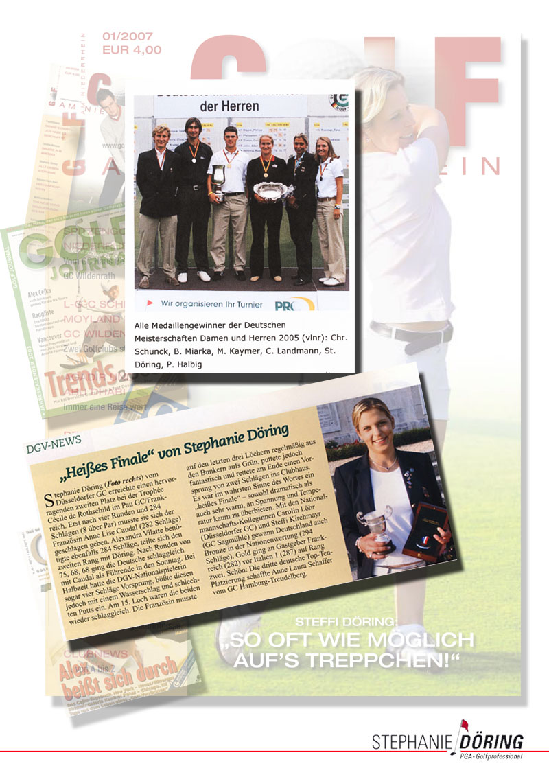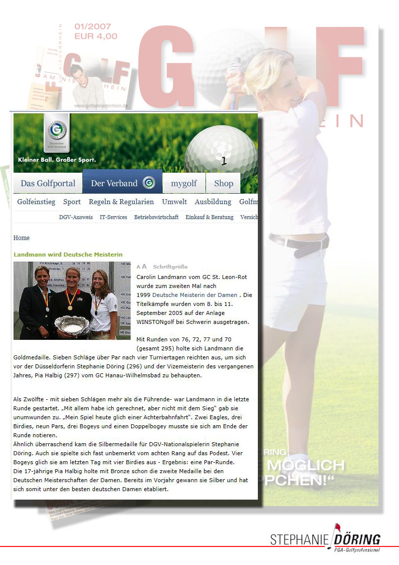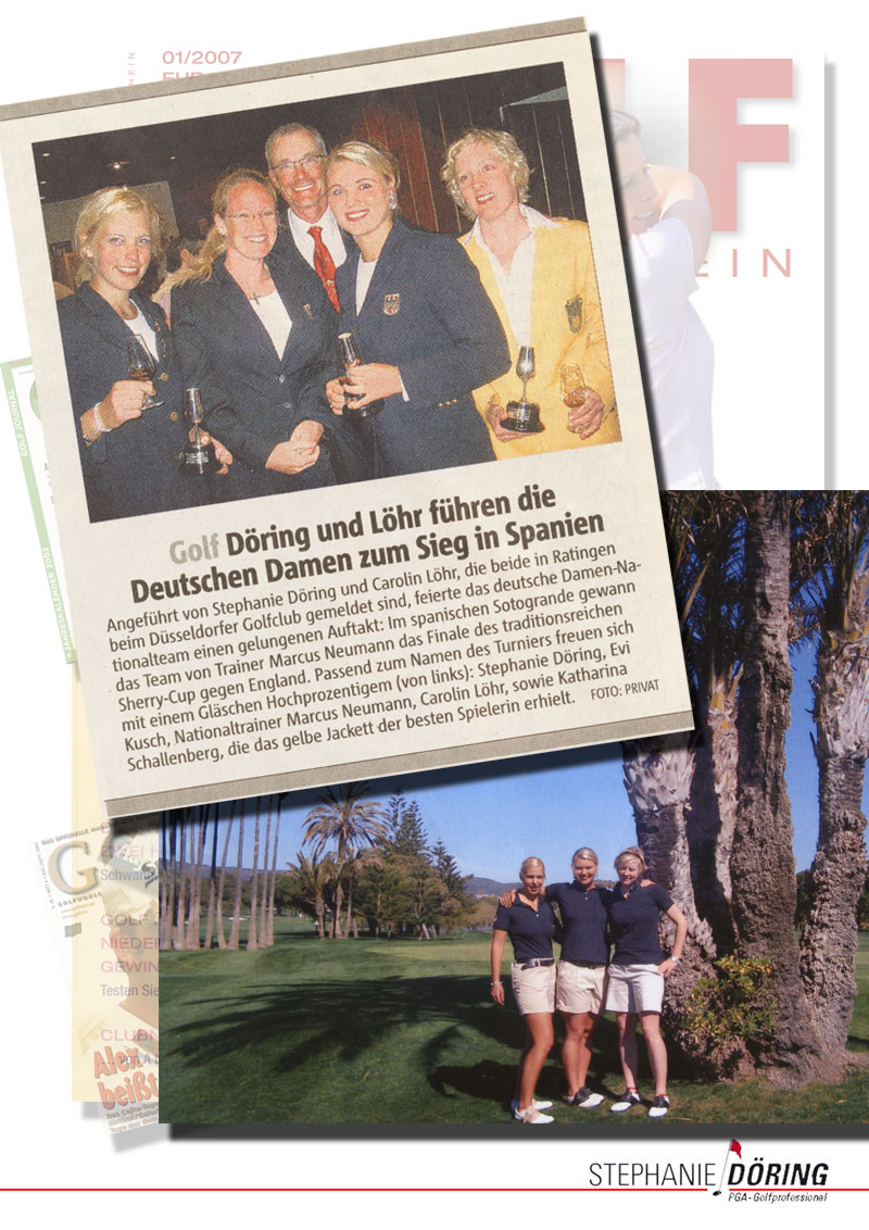 Hallo, mein Name ist Stephanie Döring. Ich spiele bereits seit 1994 Golf und es ist ein wesentlicher Bestandteil meines Lebens. Der Spaß an der Bewegung, die Konzentration und gleichzeitig die Kraft sowie die Faszination, die dieser Sport von Anfang an auf mich ausübte, veranlasst mich dazu, auch anderen diesen herrlichen Sport zwanglos, und mit Freude beibringen zu wollen.